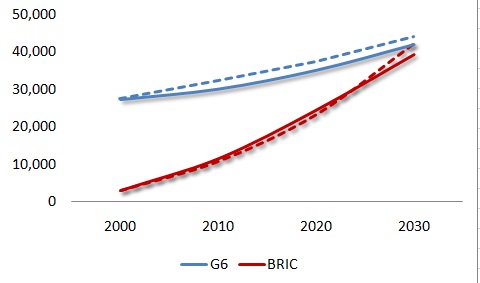 Indeed, if G6 were to be balanced with six large emerging economies – rather than just four BRIC nations – by including Indonesia, Mexico or Turkey, or Nigeria or South Africa, the trend line would prove even more prominent.