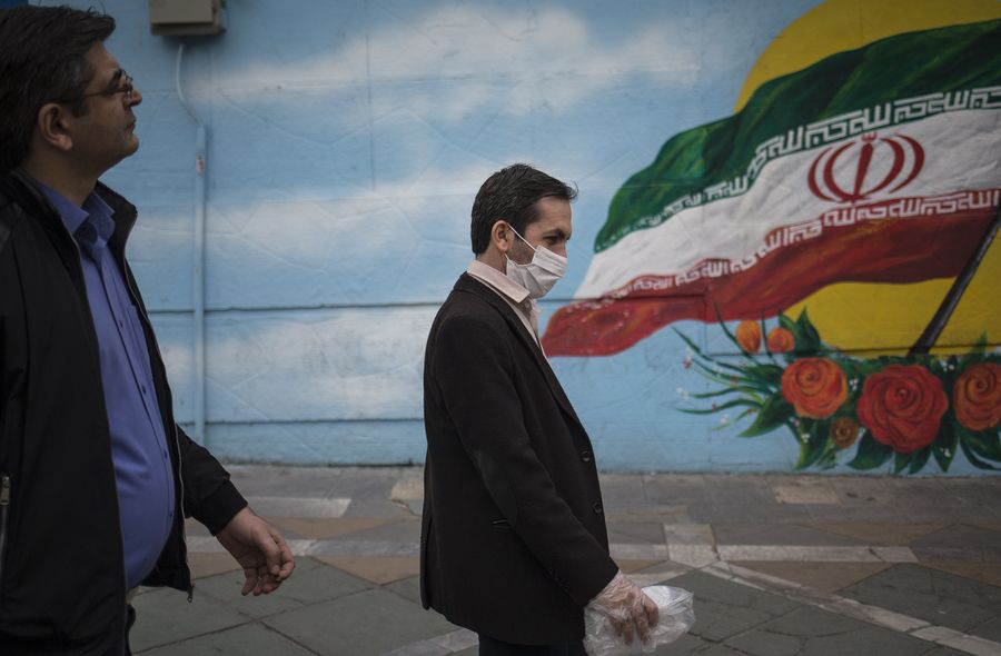 A man wearing face mask walks on a street in downtown Tehran, Iran, on March 18, 2020. [Photo/Xinhua]