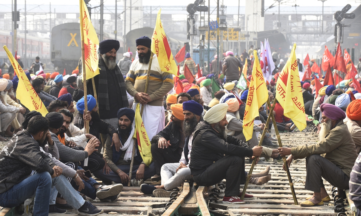 Farmers block railway tracks during a four-hour rail blockade as they continue their protest against the central government's recent agricultural reforms, at a railway station in Amritsar, India on Thursday. Authorities deployed thousands of security forces at railroad stations and tracks to prevent violence. Photo: AFP