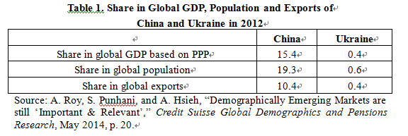 China and Ukraine are among emerging markets and China’s economy is much larger than Ukraine’s. The share in global GDP based on PPP is 15.4% for China, while 0.4% for Ukraine, the share in global population – 19.3% for China and 0.6% for Ukraine, the share in global exports stood at 0.4% in Ukraine to 10.4% in China in 2012 (table 1).[④] Thus, Ukraine is actually invisible in the global economy but even such a small country can expand opportunities and prospects for large China when entering the European markets.