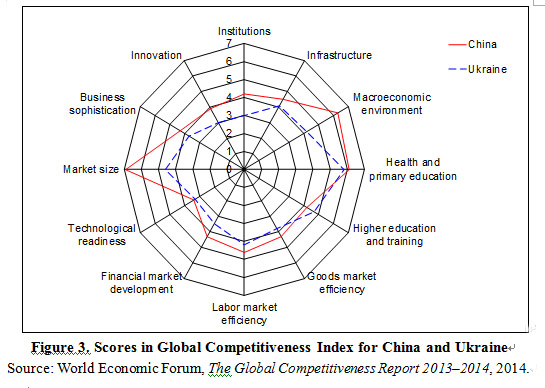 •World Economic Forum’s Global Competitiveness Index is a comprehensive tool that measures microeconomic and macroeconomic foundations of national competitiveness, which are defined as the set of institutions, policies and factors that determine the level of productivity of a country.[⑥] As shown, institutional environment in China is much better than in Ukraine (figure 3). But Ukraine receives rather high scores in such pillars as “Higher education and training” and “Technological readiness”, which also means that Ukrainians are educated, trained and are ready to produce high value added products.