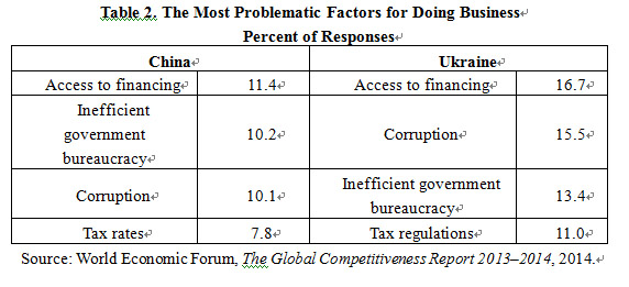 At the same time, problematic spheres for business are similar in China and Ukraine (table 2), according to the ratings of the most problematic factors for doing business.[⑦]