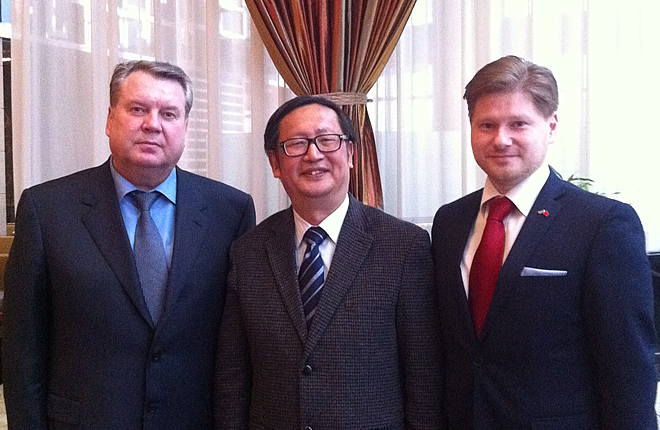 On February 25, Prof. Yang Jiemian, Chairman of SIIS Academic Council meets with Mr. Janis Urbanovics (the 1st on the le