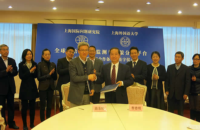 11月29日,我院同上海外国语大学签署全球多语种信息监测与决策分析平台项目合作备忘录。我院陈东晓院长和上外曹德明校长分别代表