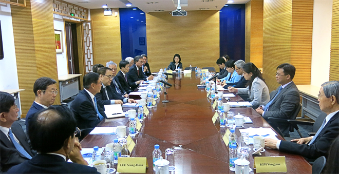 2016年4月21日,韩国首尔国际论坛高级别代表团来访我院,代表团团长为该论坛主席郑求铉(JUNG KU-HYUN), 成员包括韩国高等教育