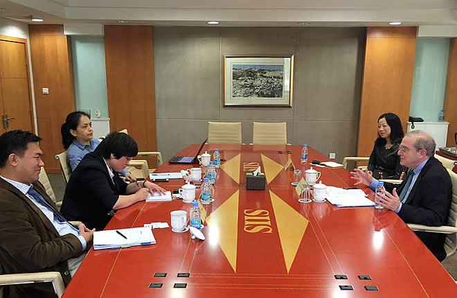 2016年5月23日,美国约翰·霍普金斯大学Krieger文理学院副院长Steven R. David教授来访,学术委员会杨洁勉主任会见了David