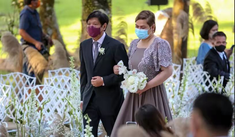 不久前的一场婚礼上,萨拉同小马科斯作为婚礼的随行人员走在一起。图源:abs-cbn